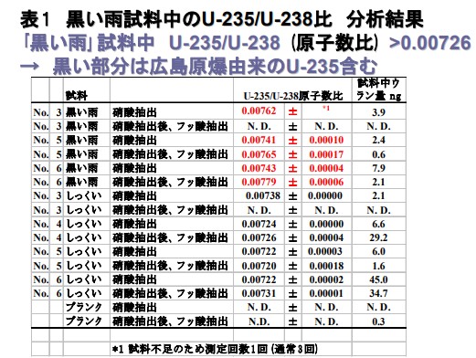1)広島原爆の黒い雨には、核分裂生成物のCs-137、天然存在比に比べて過剰のU-235、鉛等の重金属が含まれていた。ただし、白い雨、赤い雨にはCs-137は少なく、U-235は検出されなかった。